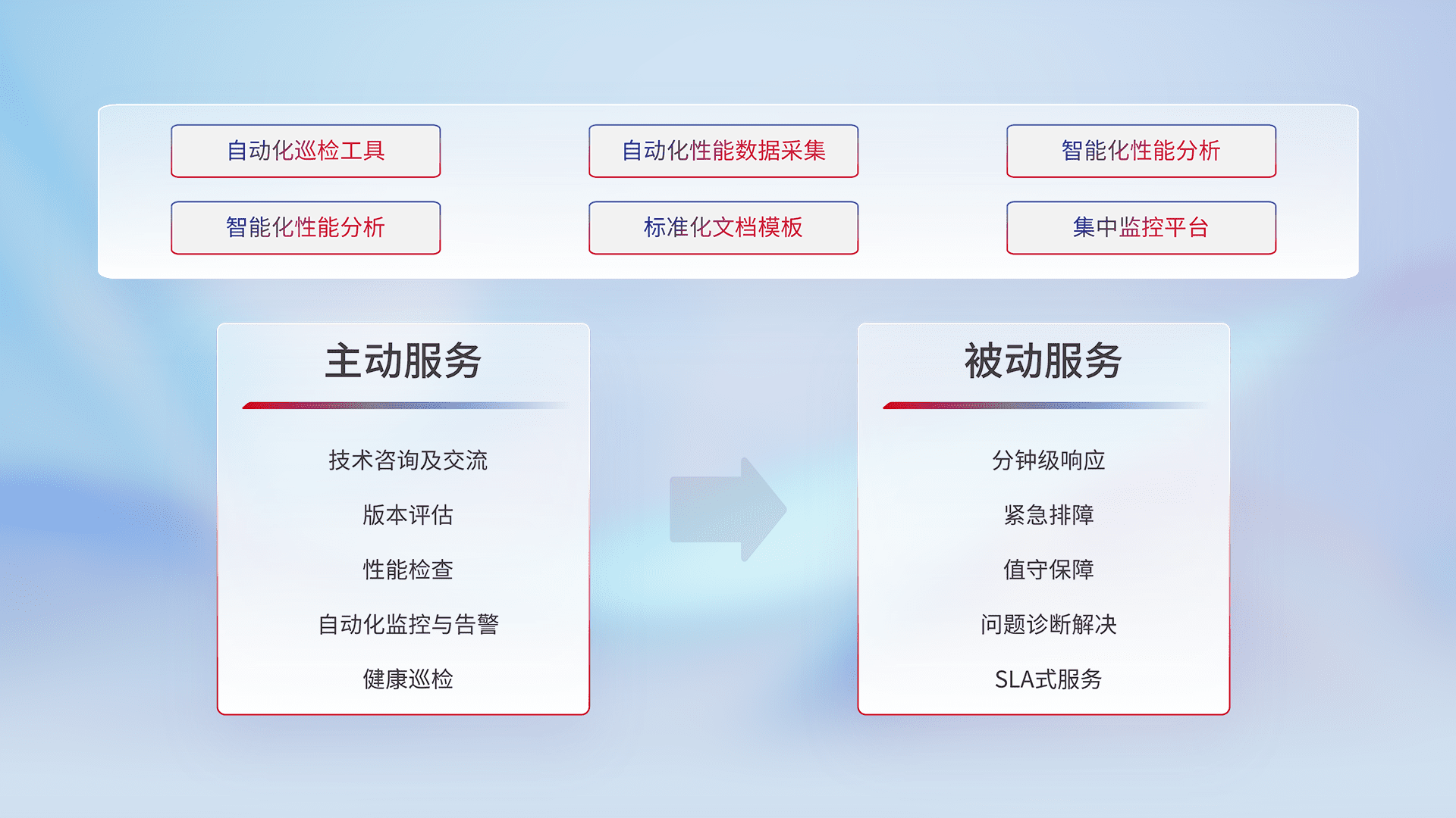 智能化工具和标准化文档,,,,保障服务质量,,提供主动服务(包含技术咨询、、、、版本评估、、、性能检查、、、自动化监控与告警、、、健康巡检)和被动服务包含(分钟级响应、、、紧急排障、、、、值守保障、、、、问题诊断解决、、、SLA服务)。。。。