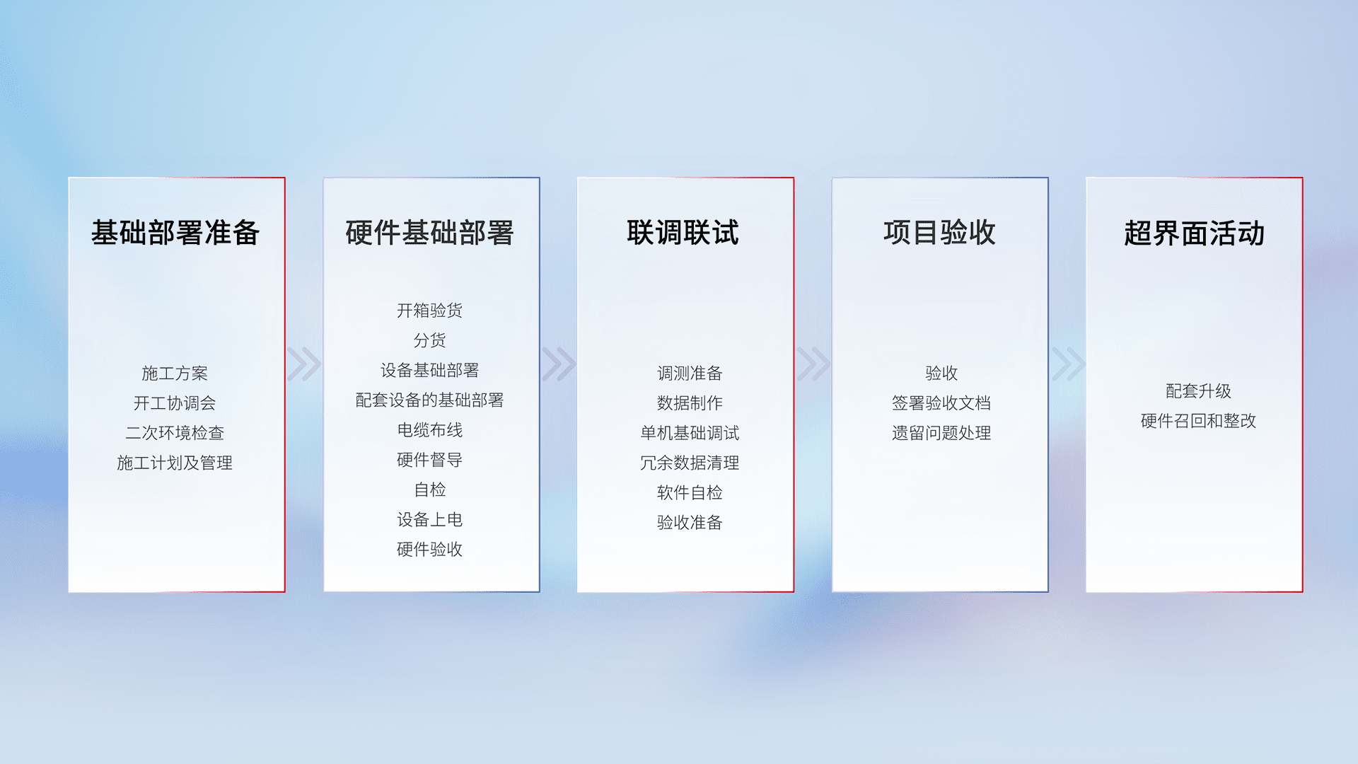 从基础部署准备、、、、硬件基础部署、、、、联调联试、、项目验收、、、越界面活动的全过程可追溯,,保证施工质量和进度。。。