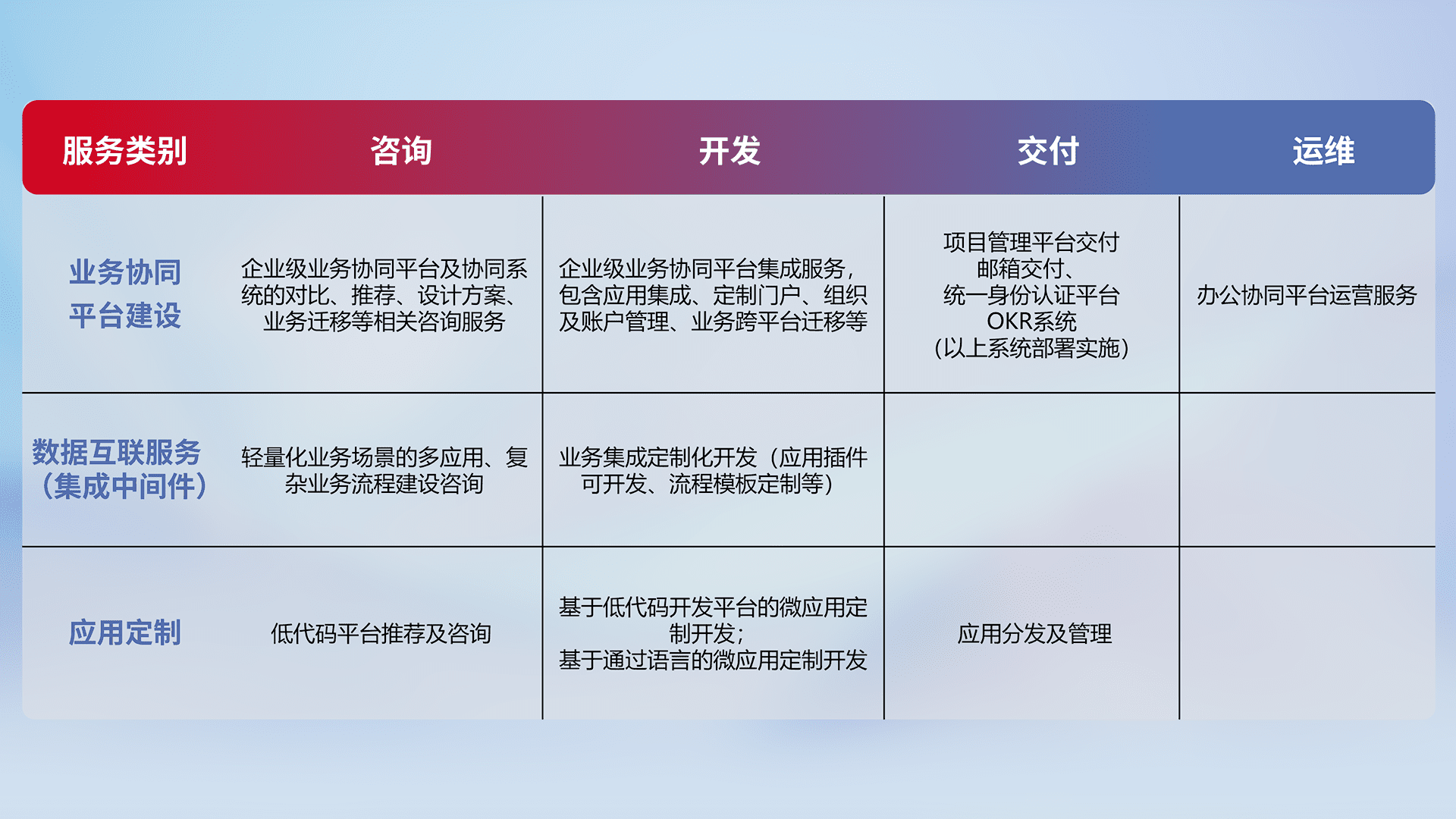 针对钉钉、、、企微、、、、IDaas等平台级产品提供产品的规划、、方案、、、、交付、、、定制化开发等服务,,实现如统一协同办公、、智能客户服务、、混合会议管理、、、智能数据查询、、、等业务场景,,实现数字化转型。。。